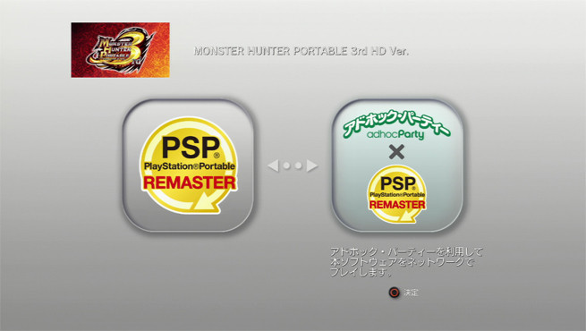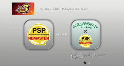 PSP Remaster 起動メニューが表示されたら「アドホック・パーティー×PSP Remaster」を選んでください。