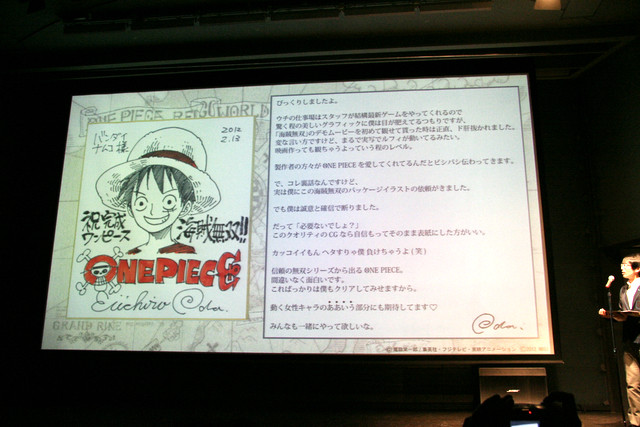 そのほかにも、原作者の尾田栄一郎先生直筆のイラスト、コメント入りのサイン色紙が公開され本作を絶賛するコメントと共に、パッケージイラストの依頼が来たが、このクオリティのCGならそのままパッケージにした方がいいと思い断ったというエピソードも記されていた。