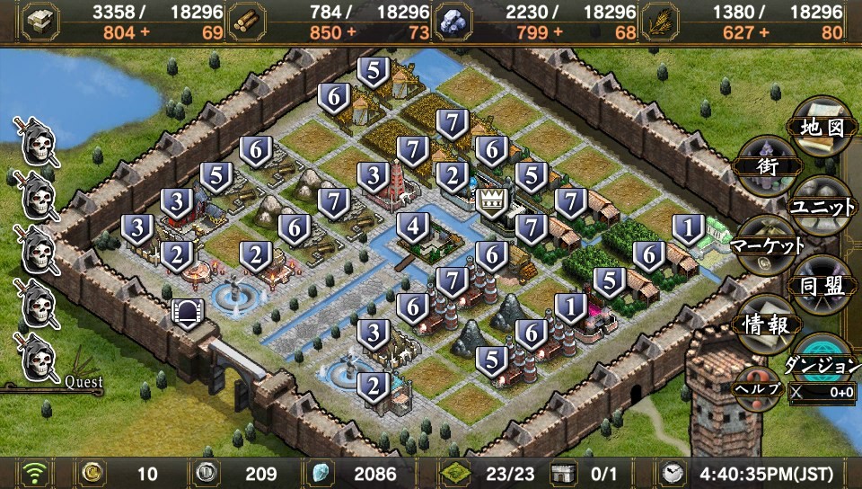 クエストクリアの報酬や時間の経過、内政での消費などによって出撃回数は自然に回復したり増えていきます。