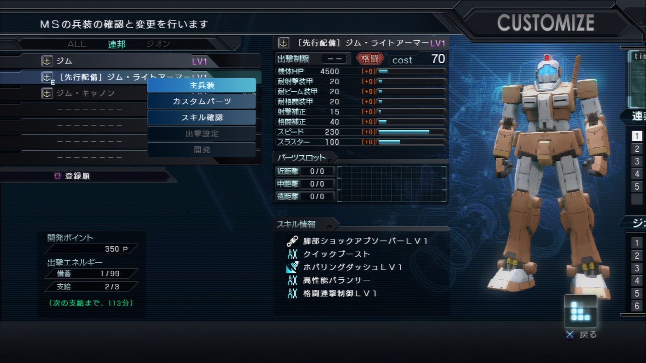 とりあえず、プレイしてみればなんとなく分かるだろうと思い、応募券ダウンロードの特典である先行配備の「ジム・ライトアーマー」に乗り込んで戦場に!