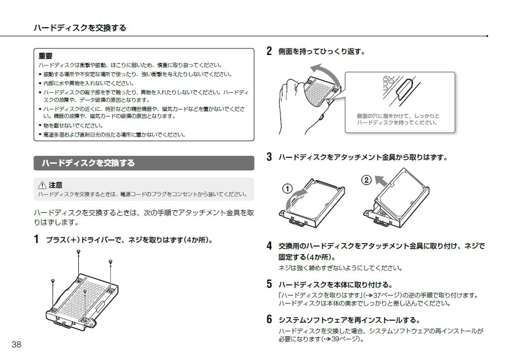 ネジを4か所取りはずし、アタッチメント金具からハードディスクを取り外し、交換する。