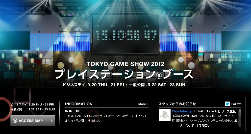 ソニー・コンピュータエンタテインメントは、2012年9月20日~9月23日までの4日間、千葉県の幕張メッセで開催される"東京ゲームショウ2012"の特設サイトを公開した。
